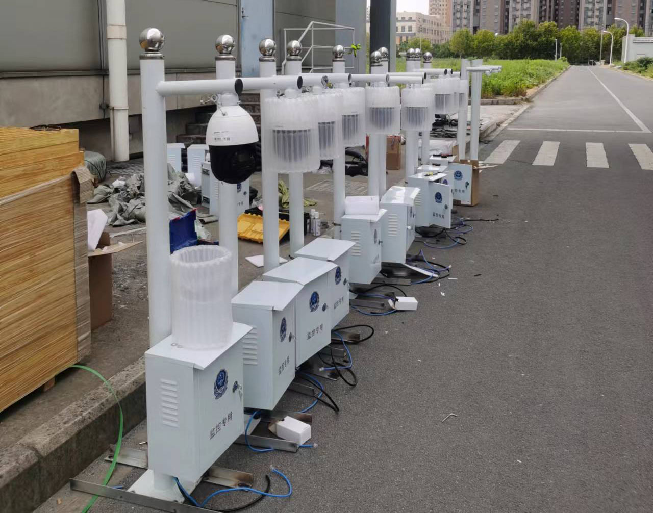 廠區(qū)道路圍墻屋頂監(jiān)控立竿安裝,全部360度攝像頭,光學(xué)22倍變焦,警戒、報(bào)警一體式。
